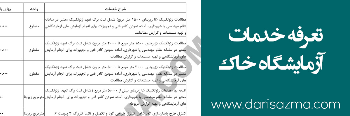دانلود فایل تعرفه خدمات آزمایشگاه خاک